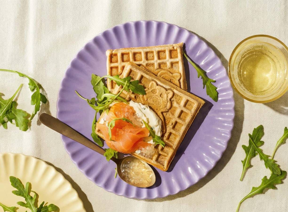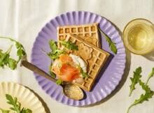 Deze hartige wafels tillen je paasbrunch écht naar een hoger niveau: warm en goudbruin uit het wafelijzer, royaal besmeerd met bieslookroomkaas en belegd met gerookte zalm en rucola. De citroensmaakparels geven een frisse twist én extra kleur.