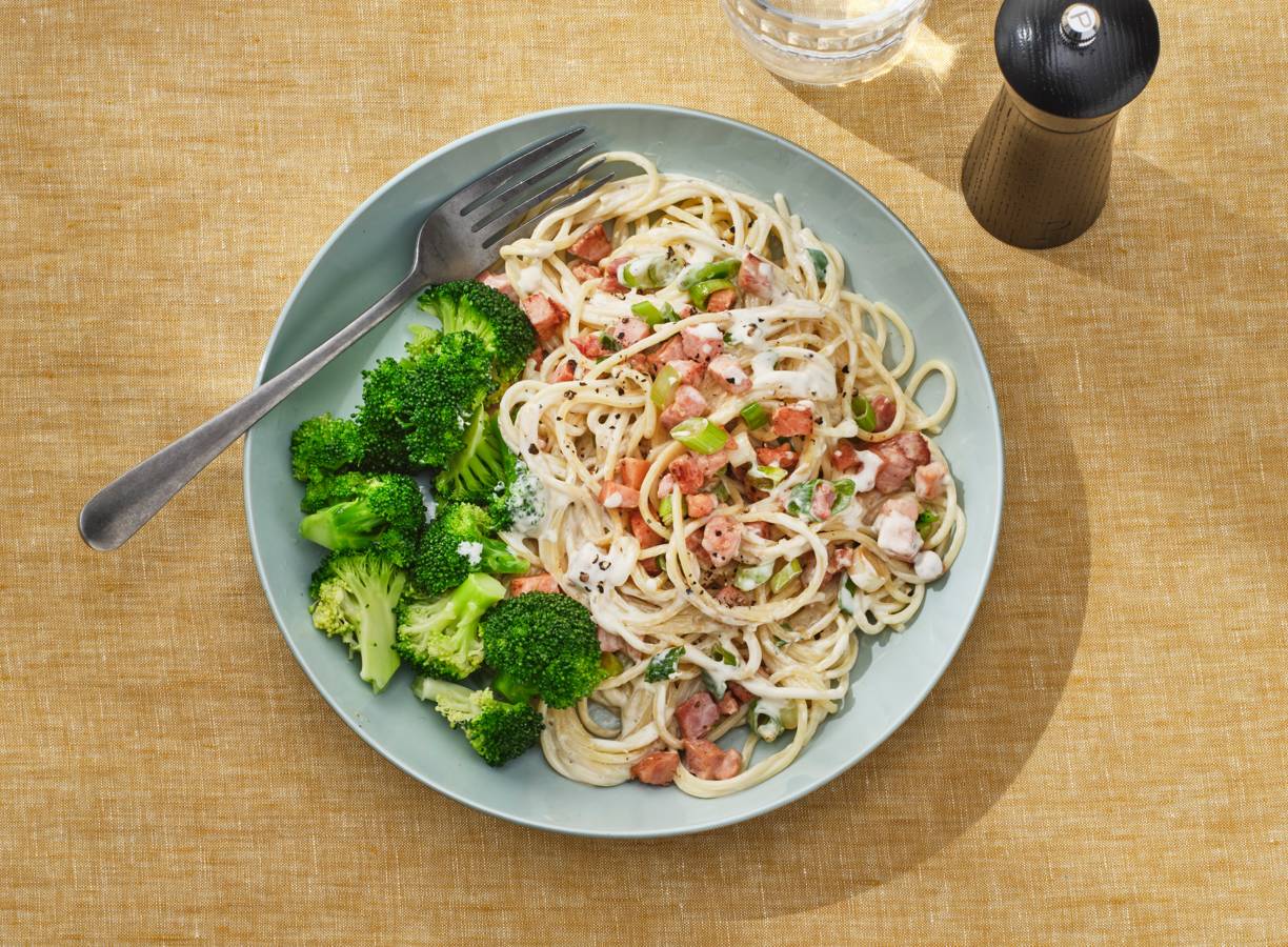 Giet de spaghetti af en bewaar een kopje kookvocht. Voeg de pasta samen met de uitgebakken spekjes toe aan de saus. Breng op smaak met peper en eventueel zout. Voeg eventueel wat extra kookvocht toe, als de saus te dik is. Verdeel de pasta over borden en serveer met de broccolisalade.