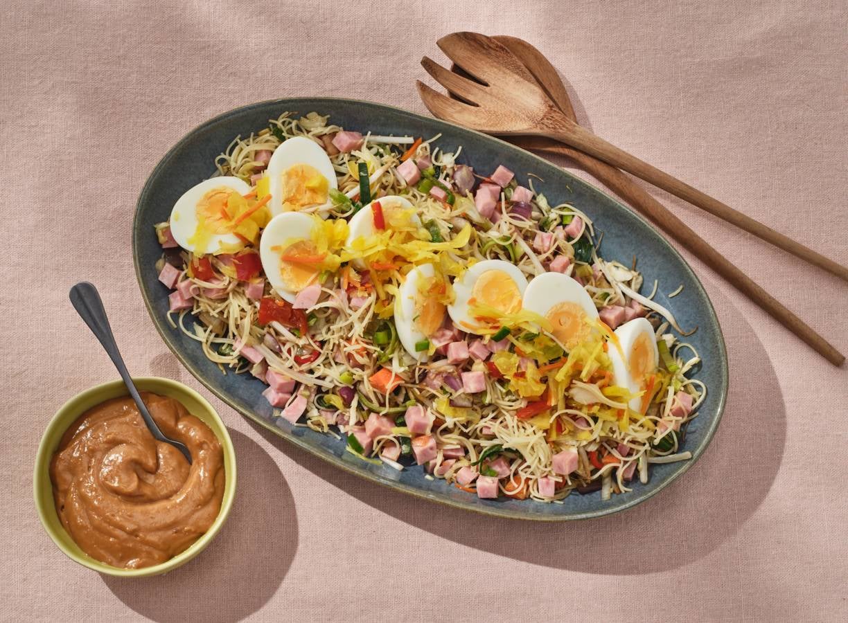 Bami met ham, ei en satésaus