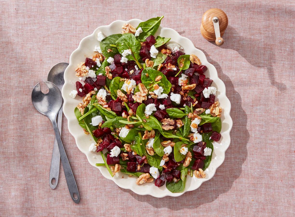 Verdeel de spinazie, biet, geitenkaas en walnoten over een serveerschaal. Besprenkel met de rest van de olijfolie.