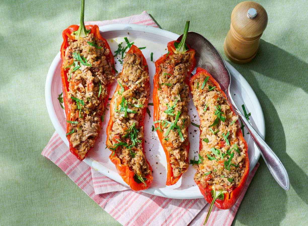Snijd de tomaat fijn en voeg toe met de tijm. Breng pittig op smaak met peper en zout. Laat de tonijn uitlekken, roer los met een vork en voeg toe. Vul de paprika's met het tonijnmengsel en besprenkel met de rest olijfolie. Zet de paprika's in een ovenschaal en bak ca. 15 min. Snijd de peterselie fijn en bestrooi de paprika's met de peterselie.
