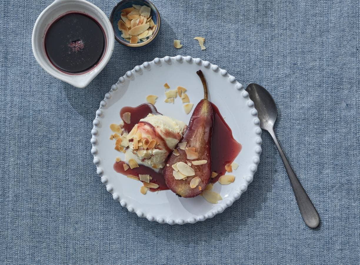 Zoek je een leuk toetje met stoofpeer? Ga voor dit eenvoudige, stijlvolle (en vooral smaakvol) bordje met stoofpeer, vanille-ijs en amandel.