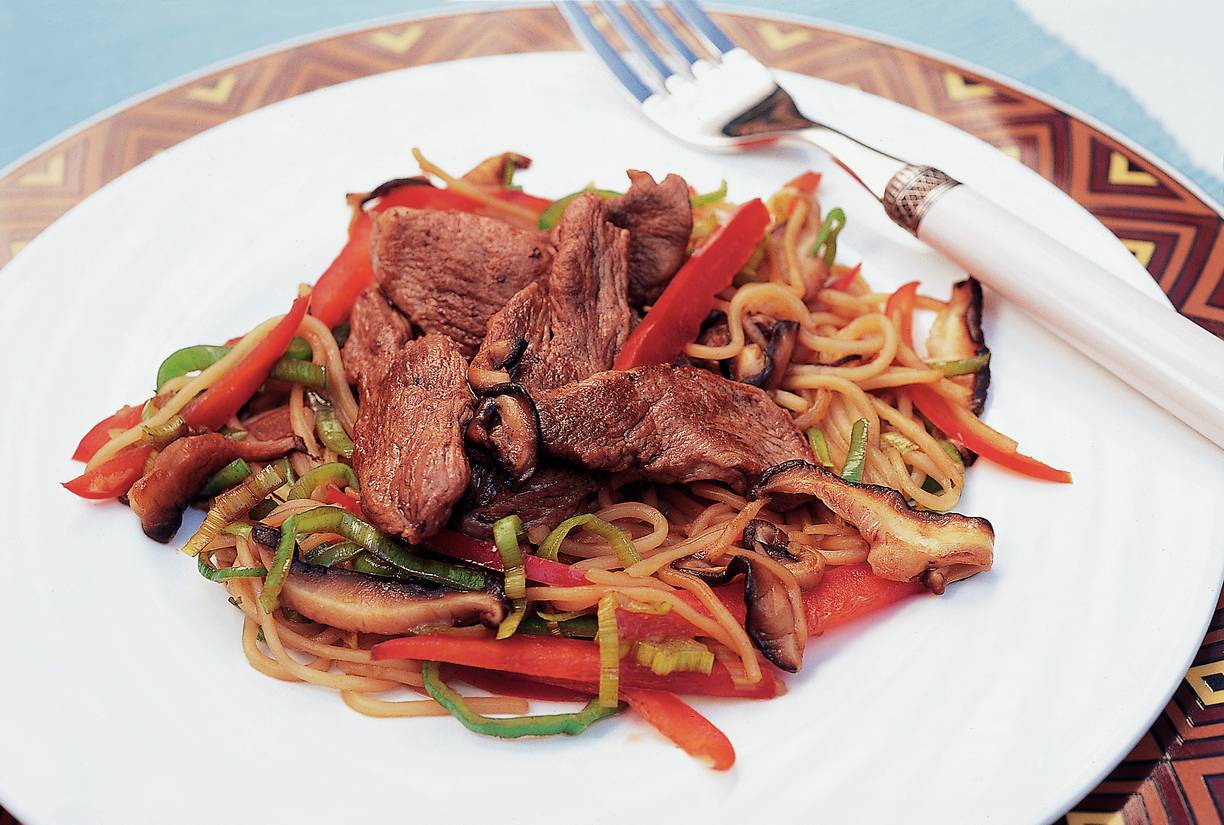 Van eendenfilets zoveel mogelijk vet afsnijden. Vlees in dunne repen snijden. Eiermie volgens gebruiksaanwijzing bereiden. Intussen in wok helft van olie verhitten. Knoflook 30 sec. al omscheppend bakken. Eendenborst toevoegen en 2 min. roerbakken, op smaak brengen met zout en peper. Vlees uit pan nemen en in aluminiumfolie verpakken. Rest van olie in wok verhitten en paprika, prei en shii-take 5 min. roerbakken. Eiermie afgieten en bij groenten in wok scheppen. Sojasaus, gembersiroop en sesamolie erdoor mengen. Eiermie met groenten over vier borden verdelen. Eendenborst op eiermie leggen.