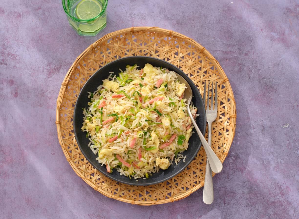 bereidingstip:Kook de witte rijst een dag van tevoren en bewaar in de koelkast tot gebruik.