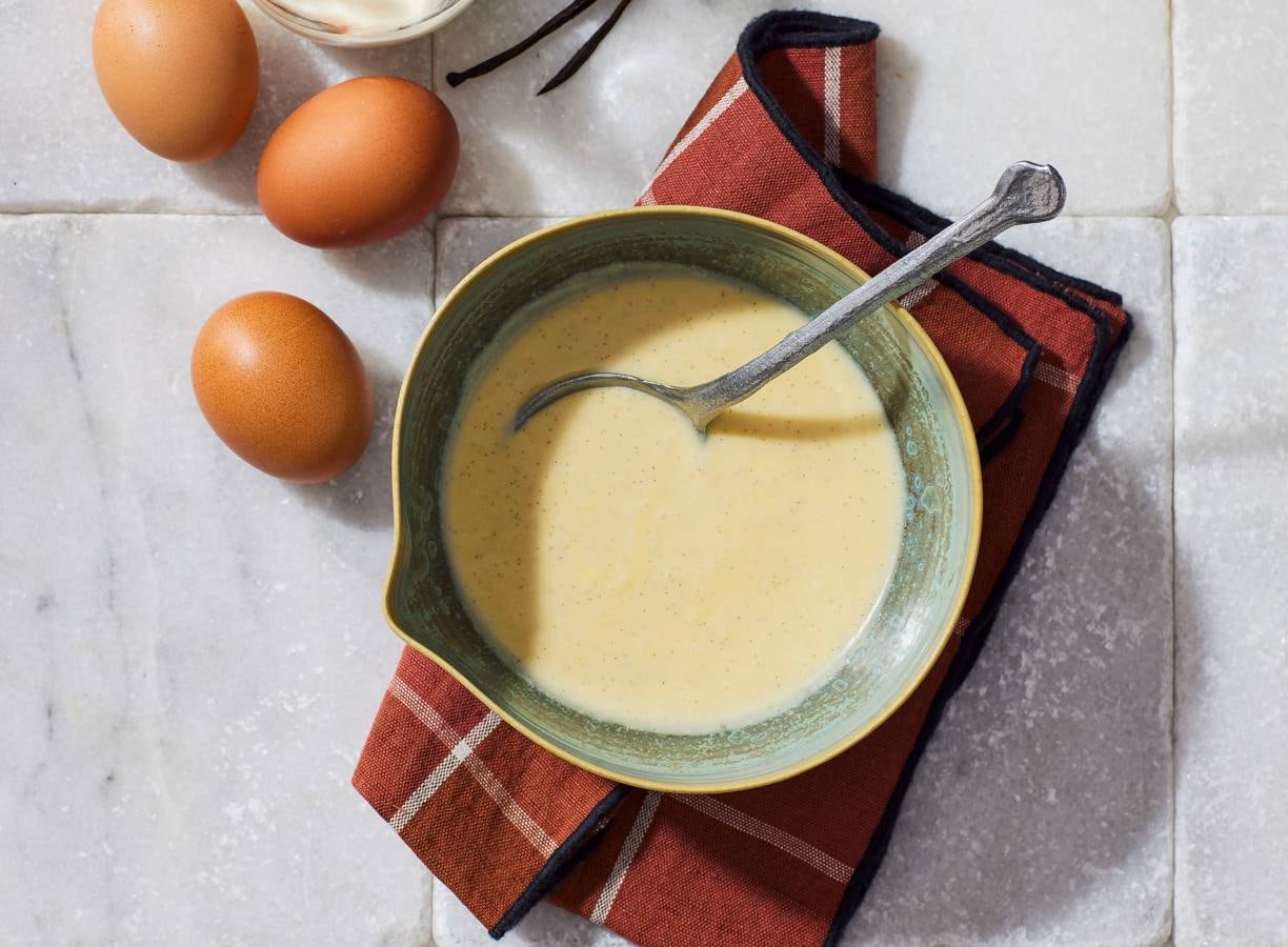 Schenk een klein scheutje hete melk bij de dooiers en roer goed met een garde. Schenk de rest van de melk erbij terwijl je met de garde blijft roeren. Giet alles terug in de pan. Zet de pan op laag vuur en verwarm de saus tot 82 °C terwijl je met een spatel over de bodem roert.