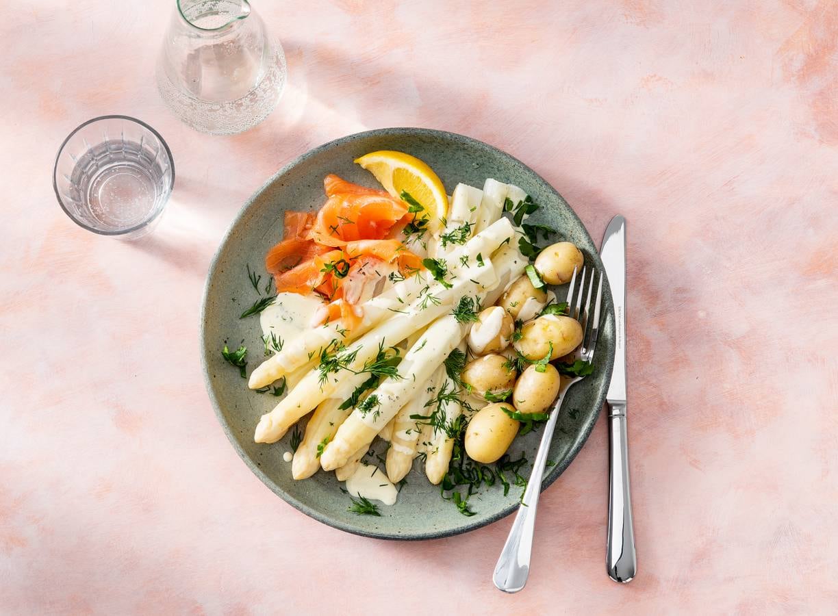 Witte asperges en zalm gaan perfect samen. Krieltjes erbij en je hebt een restaurantklassieker op je bord liggen.