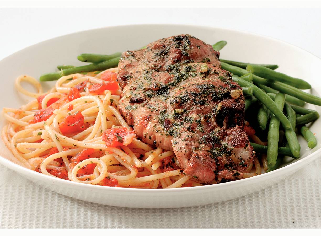 Spaghettini volgens gebruiksaanwijzing koken. Driekwart van kruiden met 2 el olie mengen. Karbonades met kruidenmengsel insmeren. Koekenpan met antiaanbaklaag verhitten en karbonades in ca. 15 min. aan beide kanten gaarbakken. Ui pellen en snipperen. Sperziebonen in 6 min. gaarkoken. In braadpan rest van olie verhitten. Ui 2 min. fruiten. Tomaten, rest van kruiden en mespunt suiker erdoor roeren en 2 min. meewarmen. Spaghettini afgieten. Tomatenmengsel erdoor scheppen. Spaghettini met zout en peper op smaak brengen. Spaghettinischotel met sperziebonen en karbonades serveren.