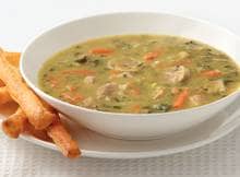 Spek en stukjes vlees (uit pakket) met erwten en 2 l koud water aan de kook brengen. Ca. 60 min. op laag vuur zachtjes laten koken. Laatste 10 min. worst en soepgroenten toevoegen en laten meekoken. Naar smaak zout en peper toevoegen. Ondertussen oven voorverwarmen op 200 °C. Ei loskloppen. Elk vel bladerdeeg bestrijken met wat losgeklopt ei en in 6 repen snijden. Bestrooien met (grof) zout en (grofgemalen) peper. Repen op bakplaat in midden van hete oven plaatsen en in ca. 5 min. goudbruin en knapperig bakken. Worst en spek uit pan kleinsnijden. Soep, worst en spek over 4 grote soepkommen verdelen. Soepstengels er apart bijgeven.