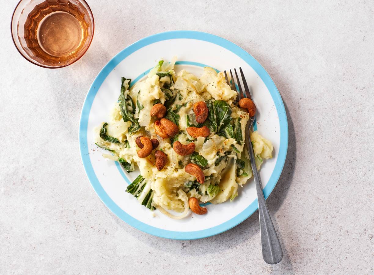 Verdeel de stamppot over de borden en bestrooi met de cashewnoten.