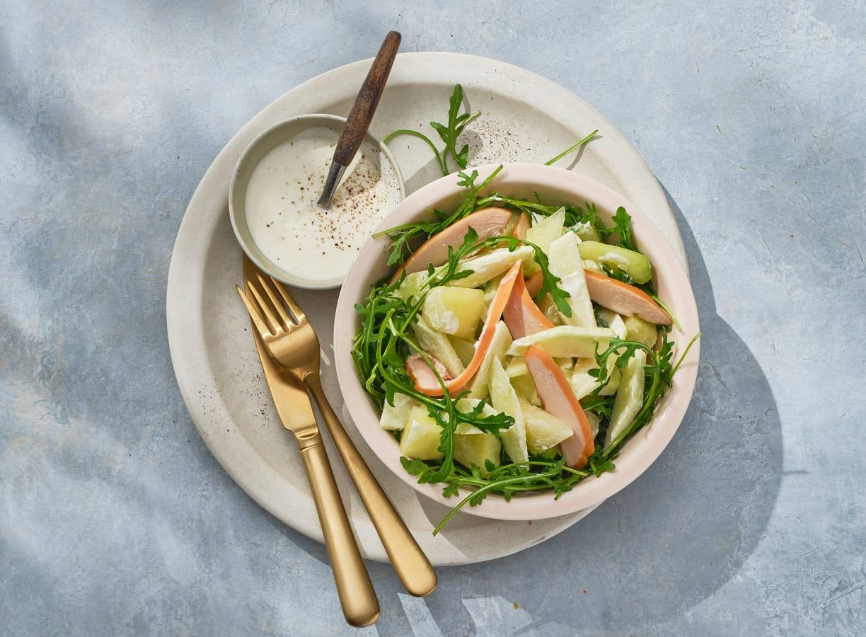 Schep de rucola op een bord, verdeel de aangemaakte appel erover, de plakjes kip en de stukken meloen.