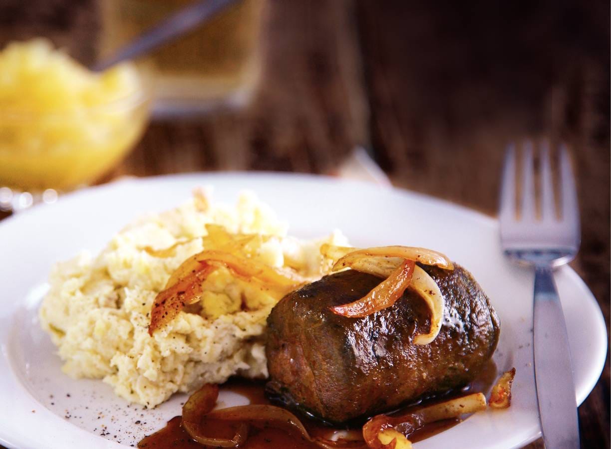 Leg de rundervinken terug in de pan. Giet de knolselderij en aardappel af en stamp fijn met de pureestamper. Roer de zuivelspread erdoor en breng op smaak met peper en zout. Verdeel de rundervinken, jus en puree over 4 borden. Lekker met appelcompote.