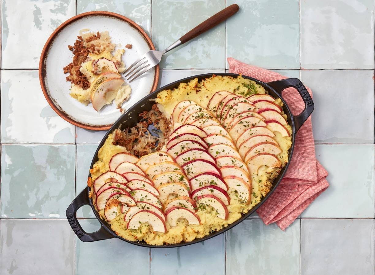 Doe de zuurkool in de ovenschaal en verdeel het gehakt en het water erover. Verdeel de aardappelpuree over het gehakt. Halveer de appels, verwijder de klokhuizen en snijd in dunne plakjes. Leg dakpansgewijs op de puree en bestrooi met de rest van de Provençaalse kruiden.