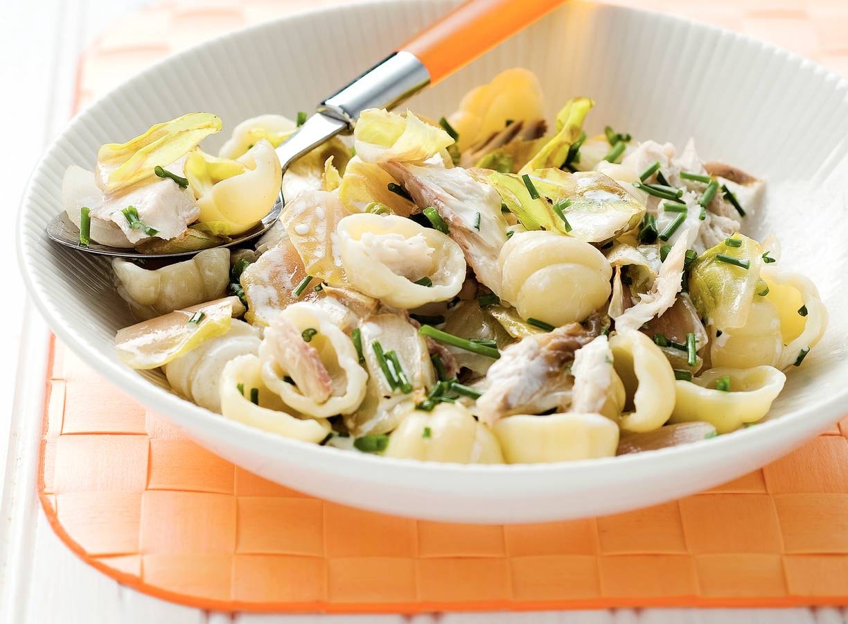 Verwijder het vel en de graten van de makreel en verdeel de vis in stukken. Snijd het witlof in grove stukken. Kook de pasta volgens de aanwijzingen op de verpakking.