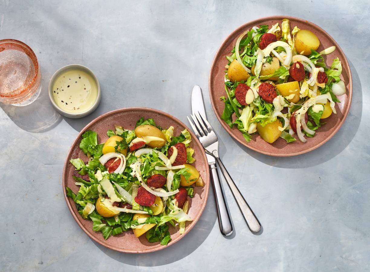Klop een dressing van de mosterd en de mayonaise en schep door de krieltjes. Voeg het andijvie-chorizomengsel en de ui toe en schep om. Breng op smaak met peper en zout. Verdeel de salade over 4 borden. Lekker met vers afgebakken meergranen boulognebrood.