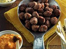 Schep de balletjes op een bord, zet er prikkers in en geef de sinaasappeldip en pittige tomatendip erbij (voor recepten zie ah.nl/recepten).