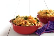 Roer het achtergehouden kookvocht en de helft van de saus door de penne met broccoli. Schep alles in de ovenschaaltjes.