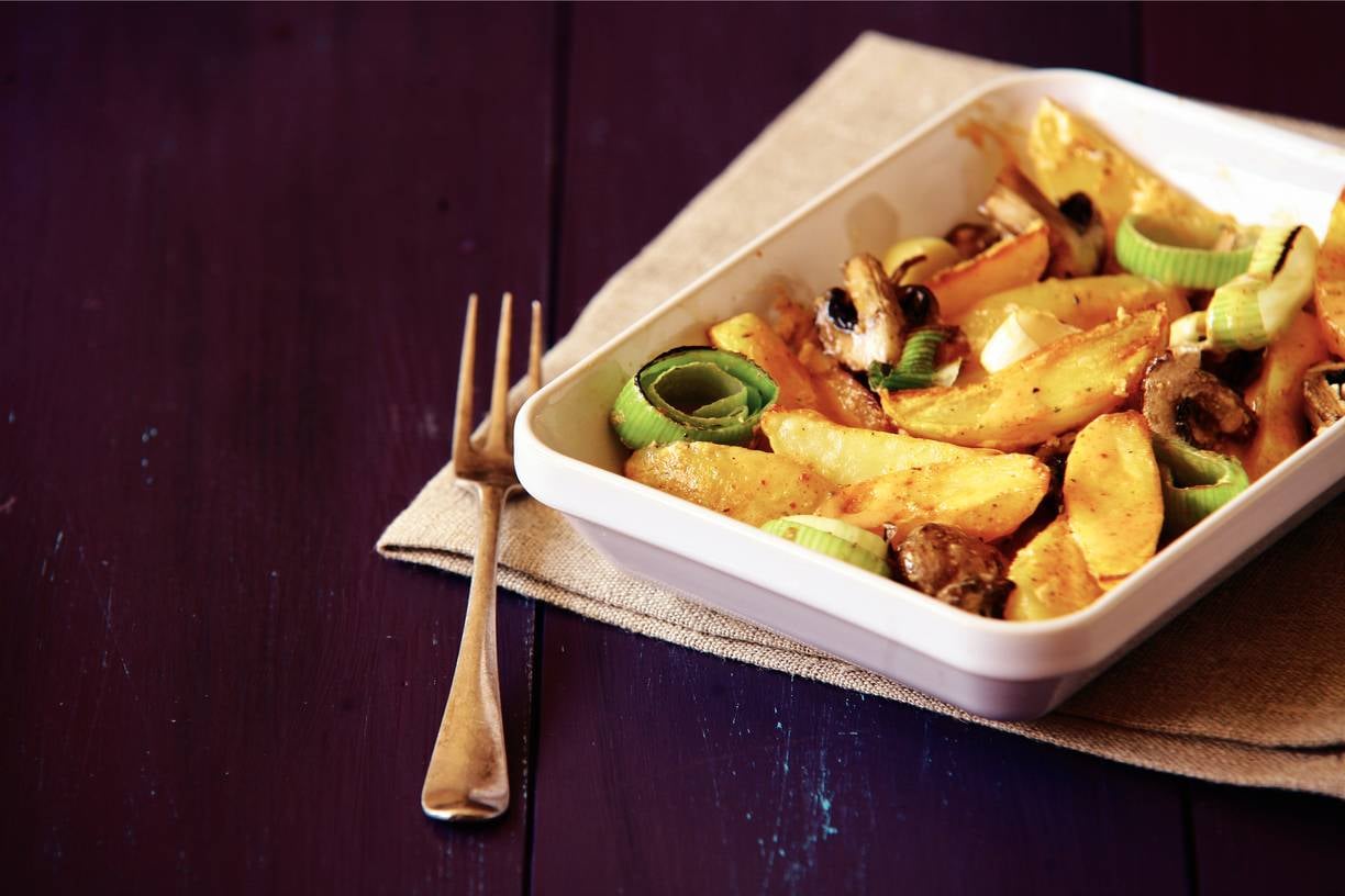 Maak de prei schoon en snijd in ringen. Maak de champignons schoon met keukenpapier en snijd in kwarten. Neem de schaal uit de oven en schep de aardappelen om met de prei, champignons en crème fraîche. Bak nog ca.15 min. tot de aardappelen gaar zijn. Dek af met aluminiumfolie als de prei te donker wordt.