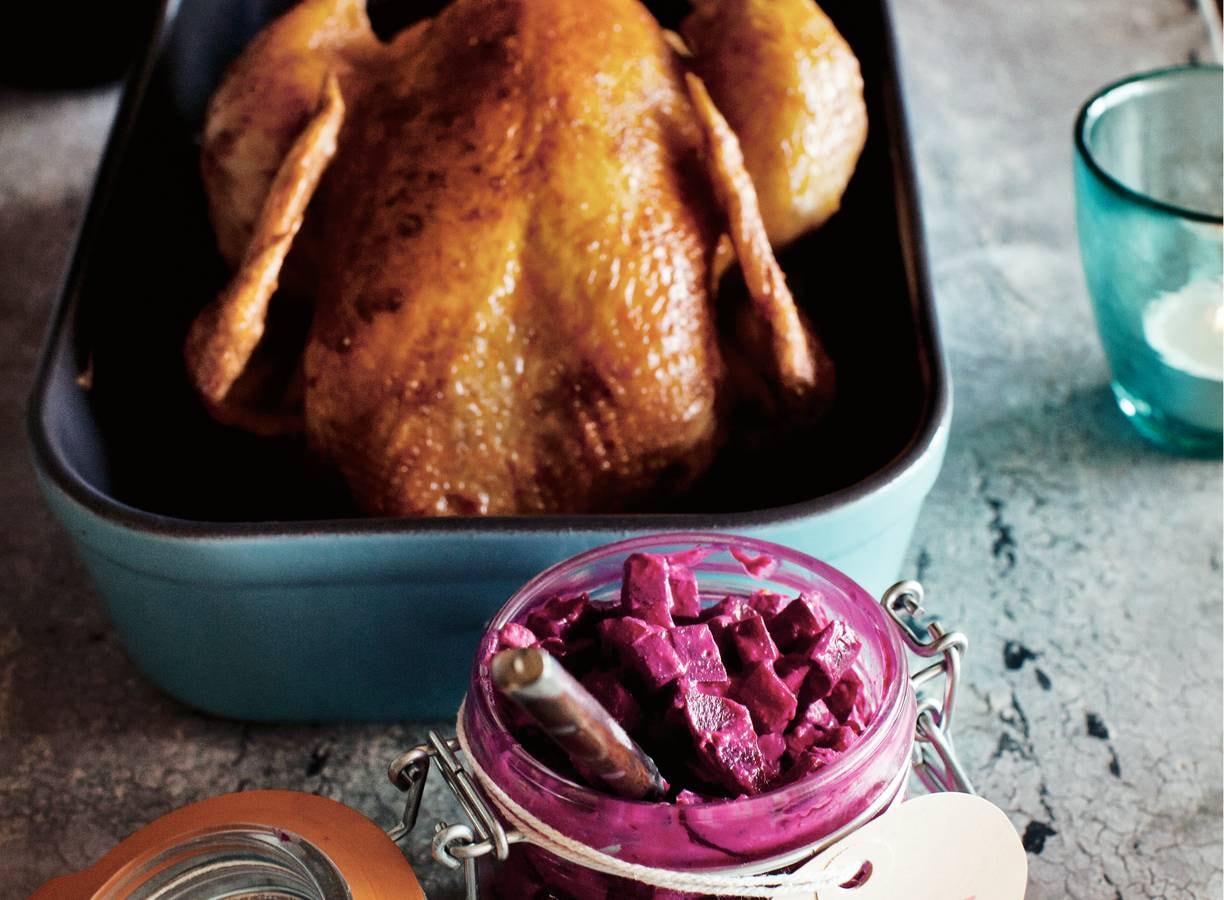 Neem de kip uit de oven en laat 15 min. rusten in de pan met de deksel erop. Serveer warm of koud met de bietenrelish.
