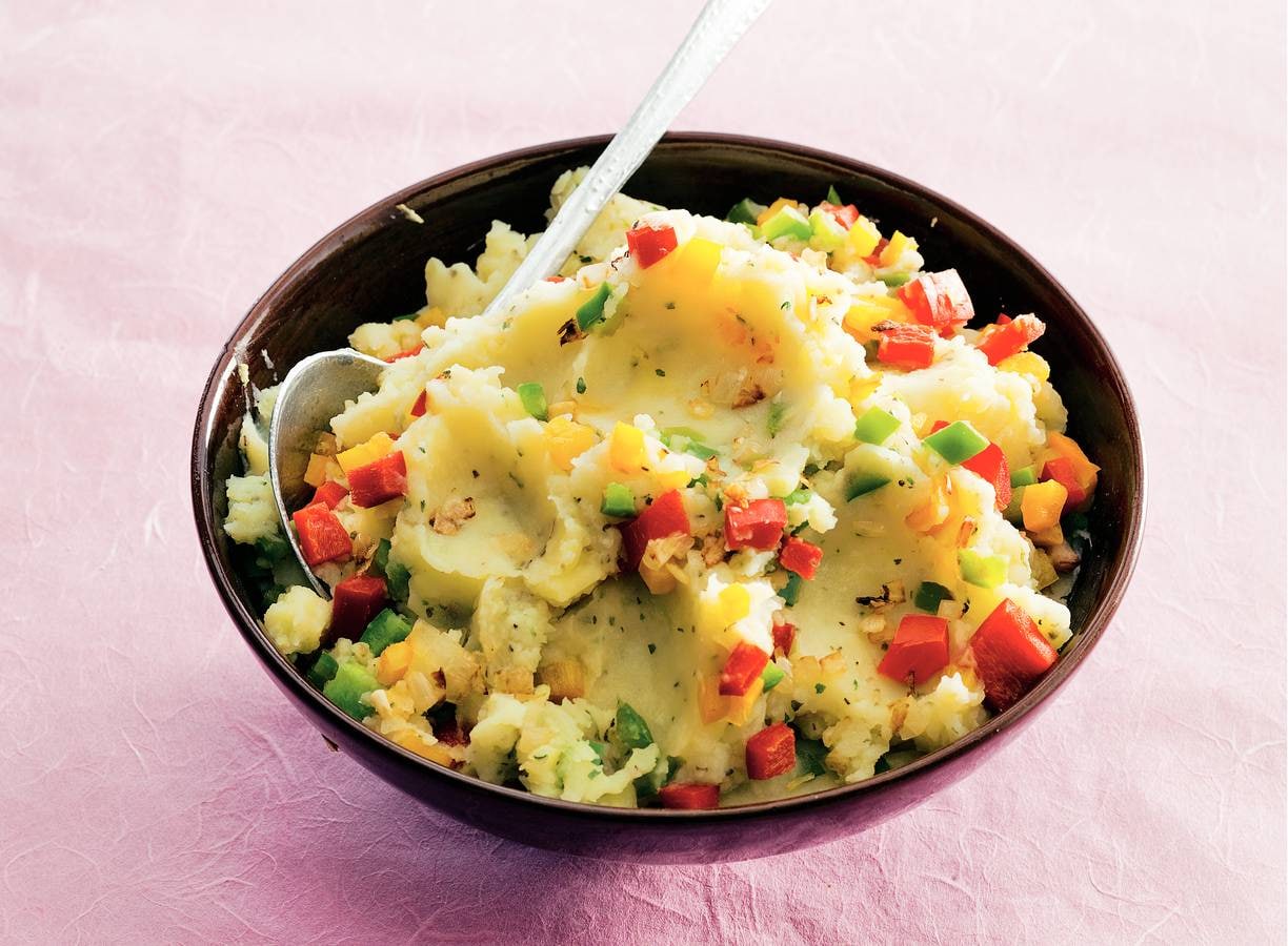 Giet de aardappelen af. Stamp met de pureestamper tot puree. Schep 3 el olie en de paprika erdoor. Voeg peper en zout naar smaak toe. Lekker met lamsworstjes.