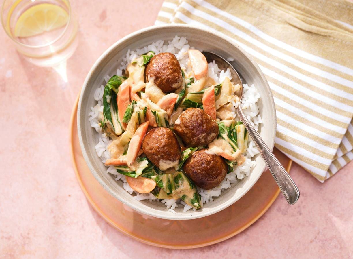 Verhit de olie in een wok. Roerbak de gehaktballetjes in 10 min. bruin. Voeg de winterpeen en paksoisteel toe en bak 5 min. mee. Meng de boemboe, Alpro cooking en het water erdoor en verwarm nog 2 min. Schep het paksoiblad erdoor en verwarm nog 1 min. Breng op smaak met peper en zout. Verdeel de rijst en gehaktballetjes met groenten over kommen.