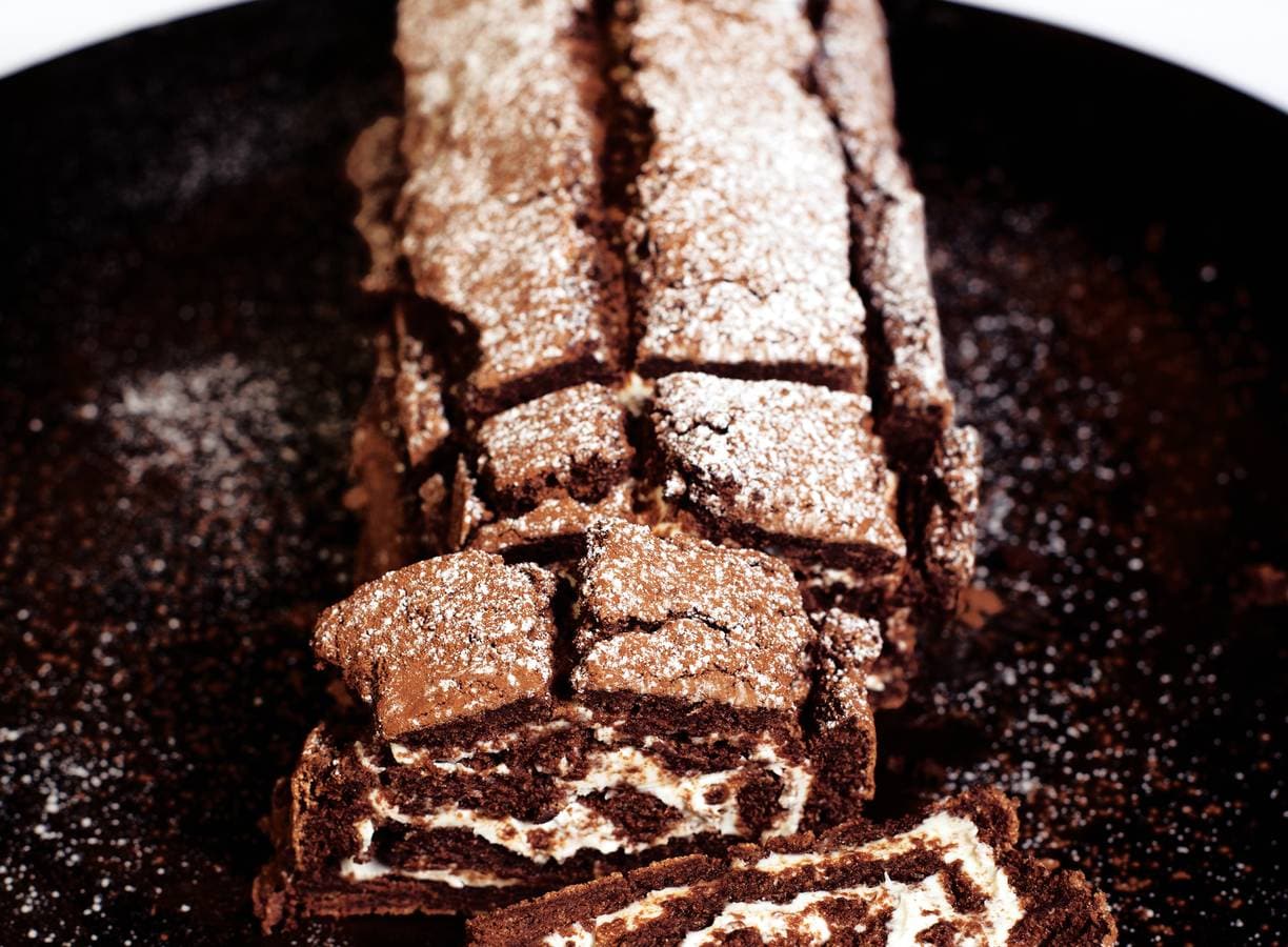 Klop de eidooiers met de suiker lichter van kleur en luchtig. Spatel de afgekoelde chocolade en boter erdoor. Klop de eiwitten in een vetvrije kom stijf en spatel luchtig door het chocoladebeslag. Verdeel het beslag over een met bakpapier beklede bakplaat tot een rechthoek van 30 x 20 cm. Strijk glad en bak in 20-25 min. gaar. De cake moet stevig en sponzig aanvoelen. Neem uit de oven en laat in 2 uur helemaal afkoelen.