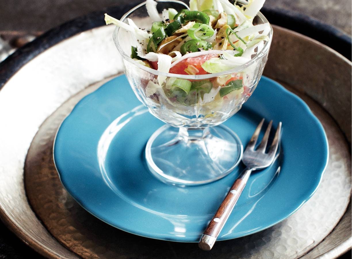 Halveer het witlof in de lengte. Verwijder de harde kern, snijd het lof in lange repen en verdeel over een lage schaal. Verdeel de partjes grapefruit erover. Meng het grapefruitsap met de olie en breng op smaak met peper en zout. Sprenkel over de salade. Strooi vlak voor serveren de noten en bosui erover.