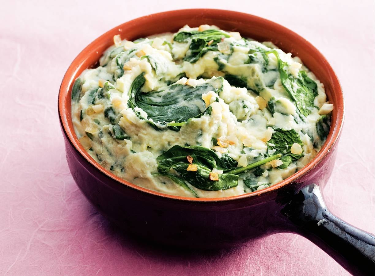 Giet de aardappelen af. Stamp met de pureestamper tot puree. Schep de spinazie erdoor en breng op smaak met peper, zout en de nootmuskaat. Lekker met een Toscaanse carré en tomatensalade.