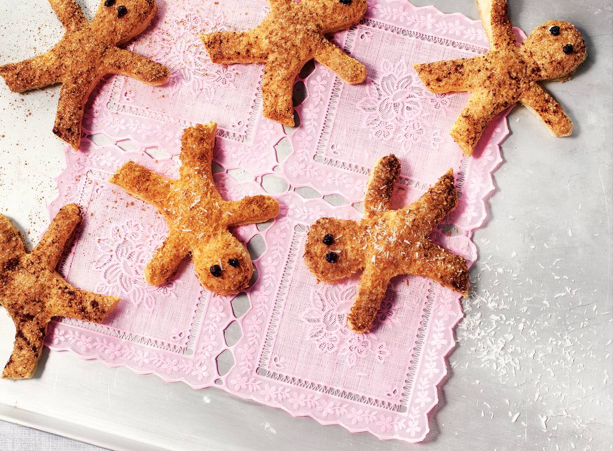 Verwarm de oven voor op 175 °C. Snijd met behulp van een sjabloon 10 poppetjes uit het bladerdeeg. Leg ze op een met bakpapier beklede bakplaat. Bestrijk dun met ei en bestrooi met suiker. Bestrooi 5 poppetjes met kaneel en 5 poppetjes met kokos. Bak de koekjes ca. 20 min. in het midden van de oven. Neem ze uit de oven en laat ze 30 min. afkoelen.
