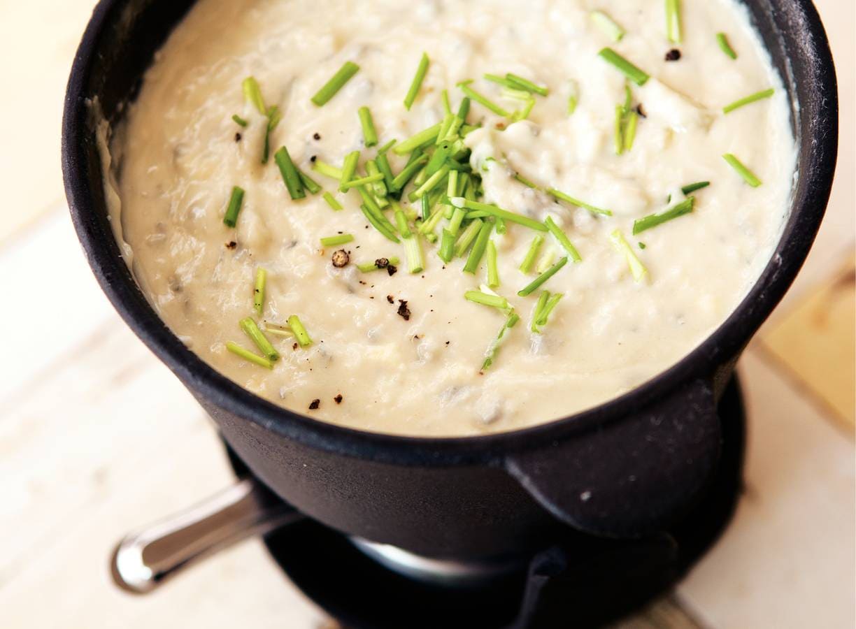 Roer de maizena met 3 el wijn tot een glad mengsel. Schenk in de caquelon of de pan en voeg de rest van de wijn toe. Breng aan de kook. Voeg het citroensap toe. Roer eerst de geitenkaas er in porties door en daarna de blauwaderkaas. Roer tot een gladde, dikke fondue. Breng op smaak met peper. Bestrooi met de bieslook.