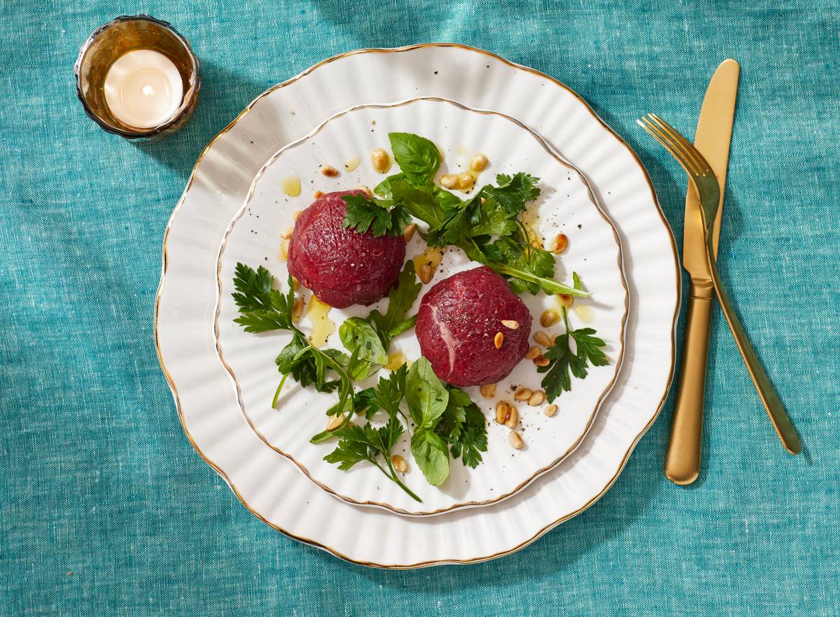 Carpaccio als voorgerecht, maar dan net even anders: een carpaccio-bonbon. Culinair hapje op sterrenniveau, zó gemaakt.