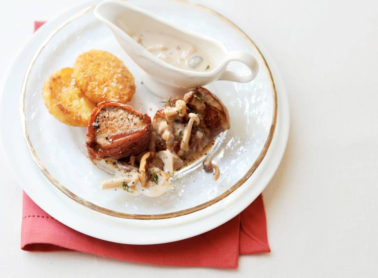 Verhit de rest van de olie in een andere koekenpan en bak het vlees in 6 min. bruin vanbuiten en rosé vanbinnen. Keer halverwege. Serveer met de saus en rösti. Lekker met aspergetips.