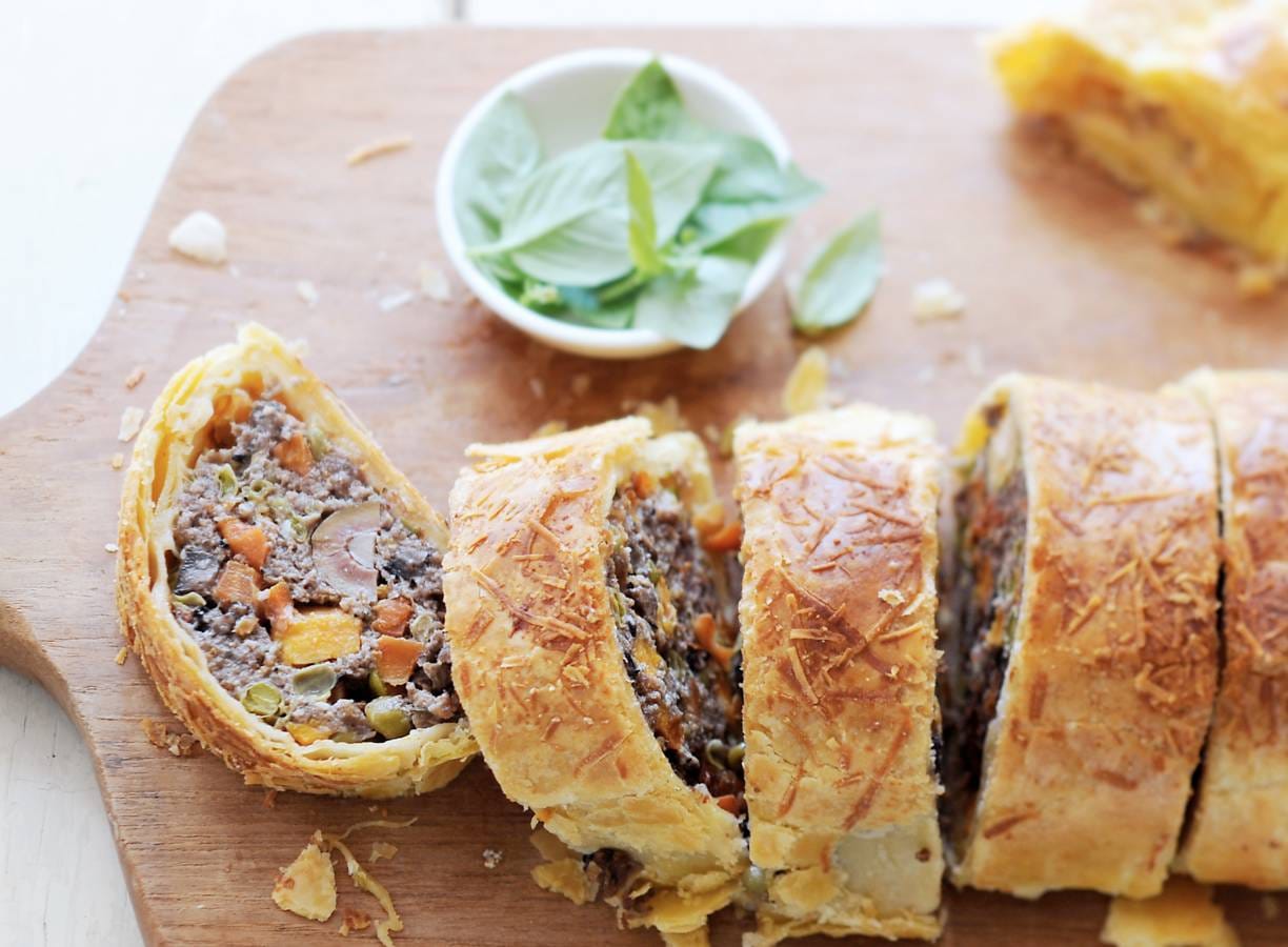 Bestuif het werkvlak met bloem. Leg de plakken deeg naast elkaar, en druk de randen goed aan. Leg het gehaktmengsel in de vorm van een lange worst erop. Bestrijk de randen van het deeg waar geen gehakt op ligt met wat ei. Rol het gehakt volledig in het deeg. Knijp de uiteinden dicht. Leg de Wellington op een met bloem bestoven bakplaat. Verdeel de rest van het ei en de rest van de kaas erover. Bak in de oven in 1 uur goudbruin. Lekker met tomatenrisotto en groene salade.