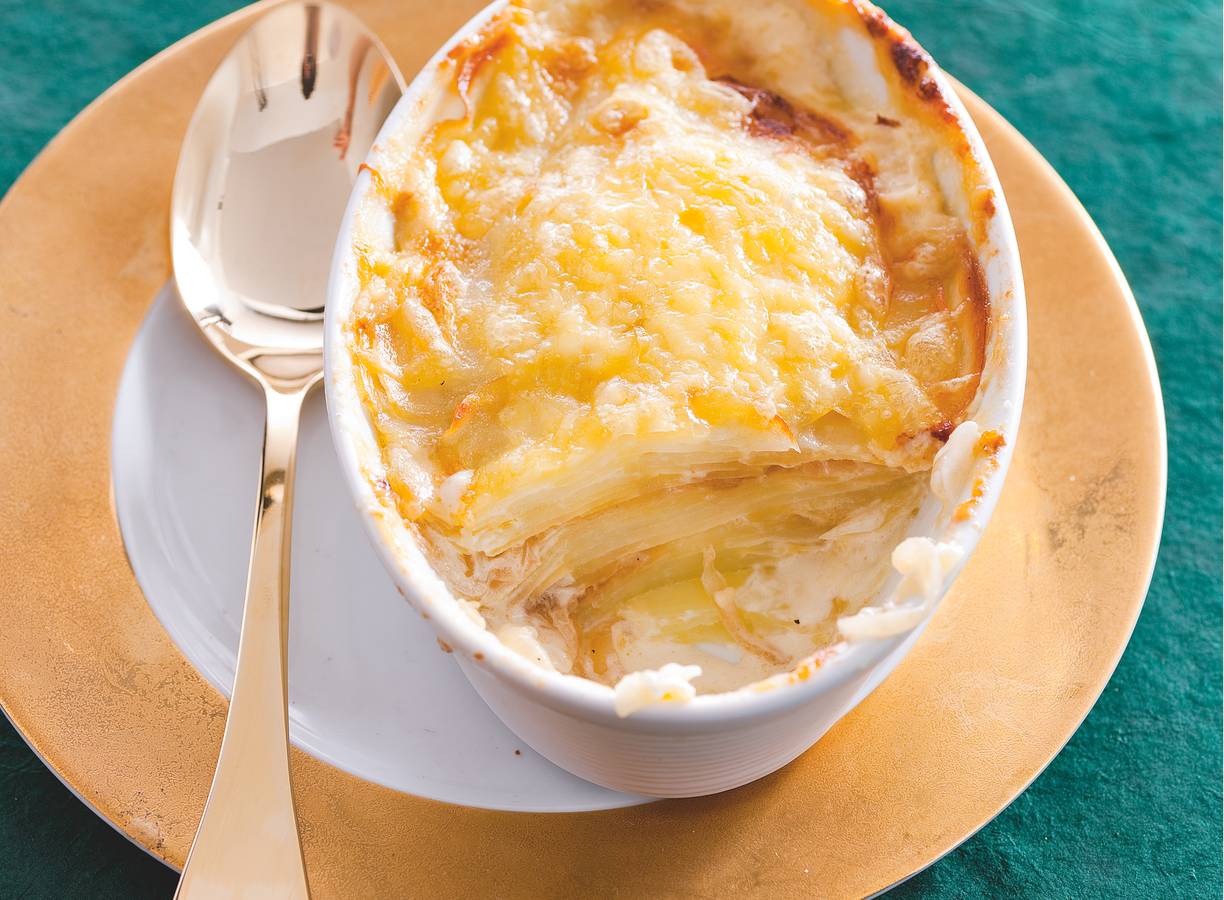 Verwarm de oven voor op 180 °C. Snijd de ui in dunne ringen. Verhit de boter in een koekenpan en bak de ui op laag vuur in 15 min. zacht en lichtbruin. Schep af en toe om. Breng op smaak met peper en zout. Schil ondertussen de aardappelen en snijd ze in flinterdunne plakjes.