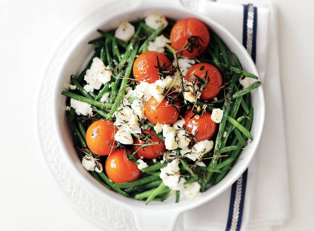 Verwarm de oven voor op 200 °C. Doe de tomaten in de ingevette ovenschaal. Verdeel 2 el olie, de tijm, peper en zout erover. Rooster 20 min. in de oven. Verwijder de steelaanzet van de haricots verts, maar laat het puntje zitten. Kook de bonen 6 min. in water met zout. Voeg toe aan de tomaten in de ovenschaal. Besprenkel met rest van olie en verkruimel de kaas erboven. Bak 10 min. in de oven.