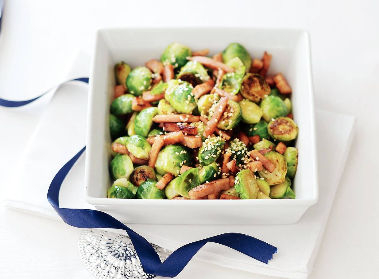 Halveer de spruitjes. Kook ze in water met zout in 10 min. beetgaar en giet af. Rooster de sesamzaadjes in een pan zonder olie en/of boter in 3 min. op middelhoog vuur goudbruin. Verhit de helft van de boter in een koekenpan en bak de hamreepjes 5 min. Voeg de spruiten en de rest van de boter toe. Breng op smaak met peper en zout. Bestrooi met het sesamzaad.