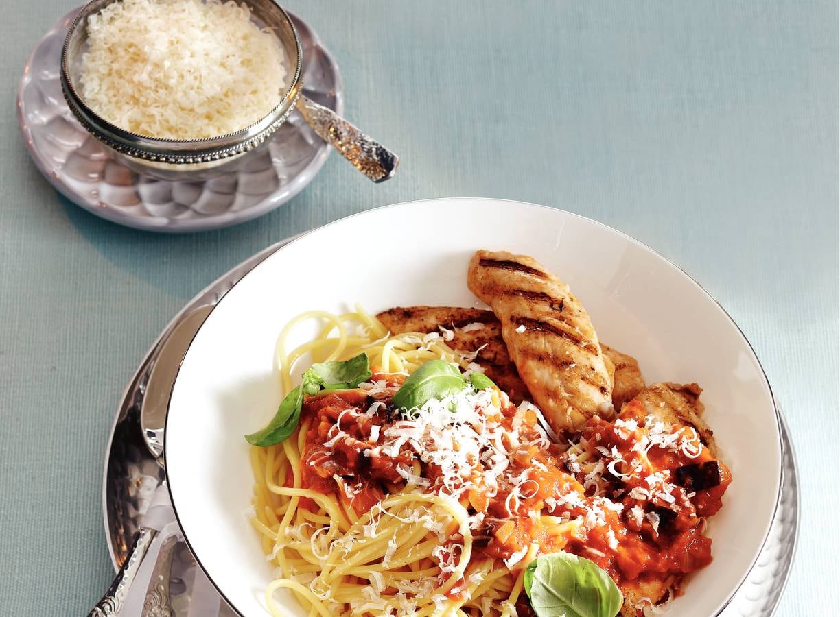 Verdeel de pasta over 4 diepe borden. Schep de saus en kip erop. Lekker met vers basilicum en Parmezaanse kaas.