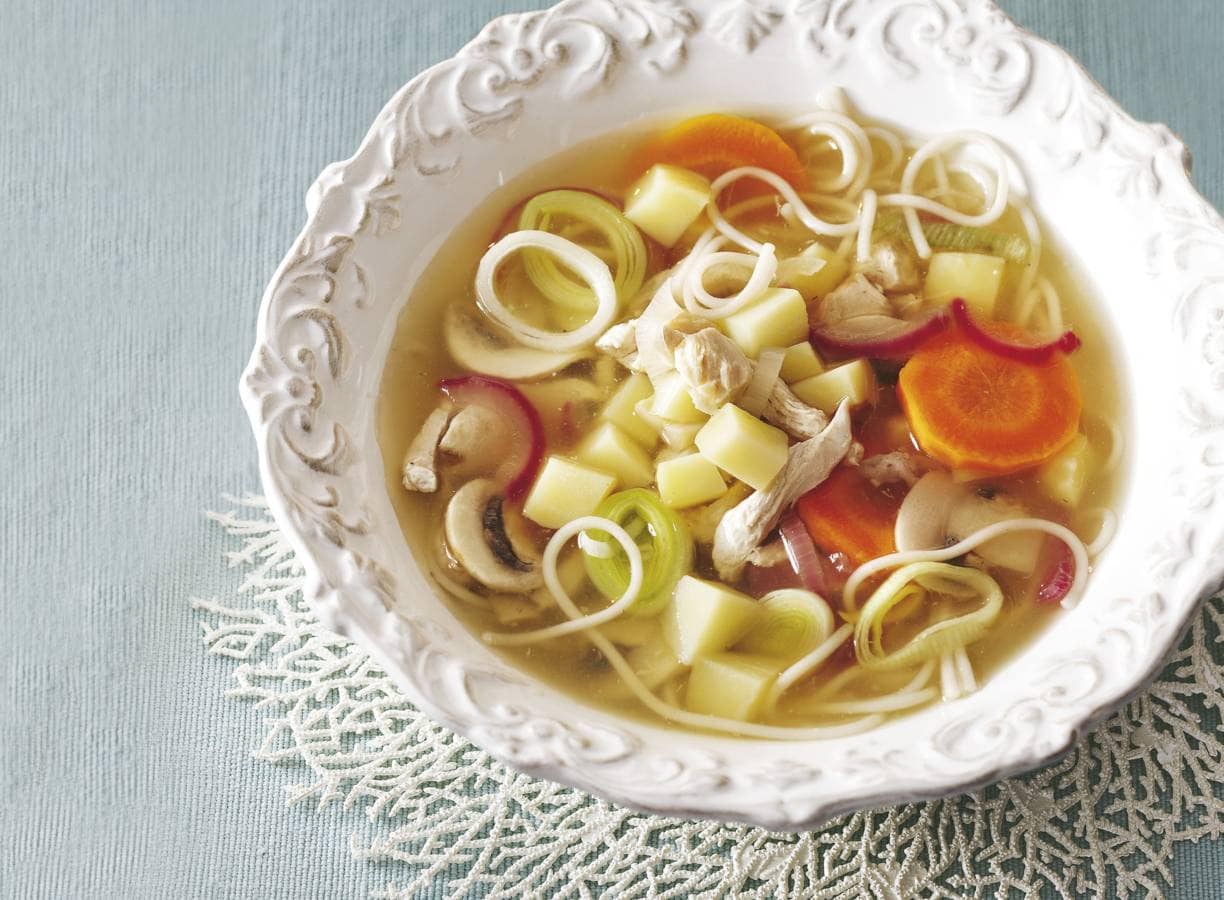 Snijd de peen in dunne plakjes. Was en snijd de prei in halve ringen. Snijd de ui in halve ringen. Snijd de champignons in plakjes. Voeg de peen, prei, ui, champignons en de aardappelen toe aan de bouillon. Laat 5 min. zachtjes koken. Snijd de kip in dunne reepjes. Voeg de kip en vermicelli toe en laat nog 6 min. koken.