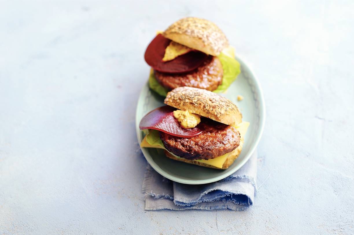 Verwarm de oven op 220 °C. Bak de broodjes in de oven in 6-8 min. Verhit ondertussen een grillpan en bak de hamburgers in 8 min. gaar. Keer halverwege. Beleg elk broodje met 1 plakje kaas, 1 blaadje kropsla en 1 hamburger. Verdeel het gesneden bietje over de burgers en schep op elke burger 1 tl mosterd. Lekker met een tomatensalade met broccoli.