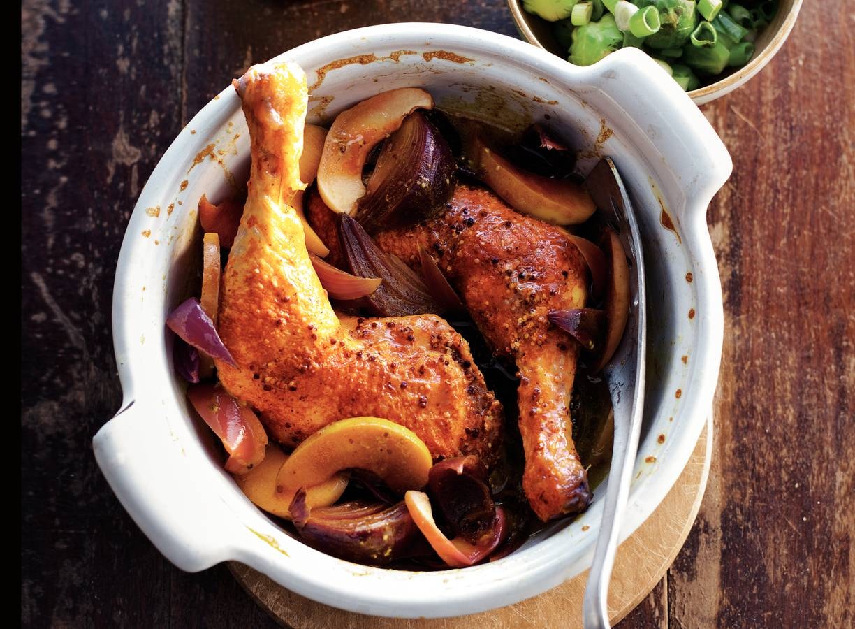 Kip met rode ui, appel en mosterd