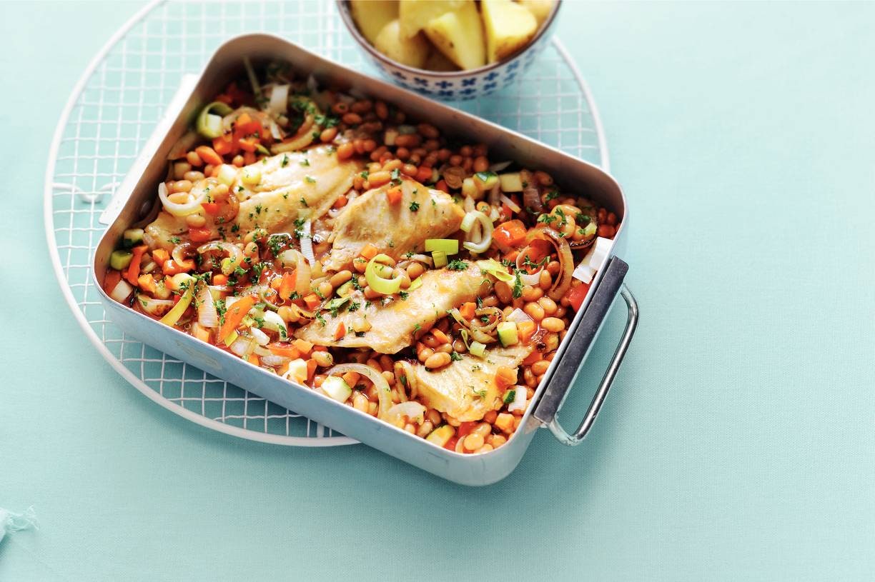 Bonenschotel met vis