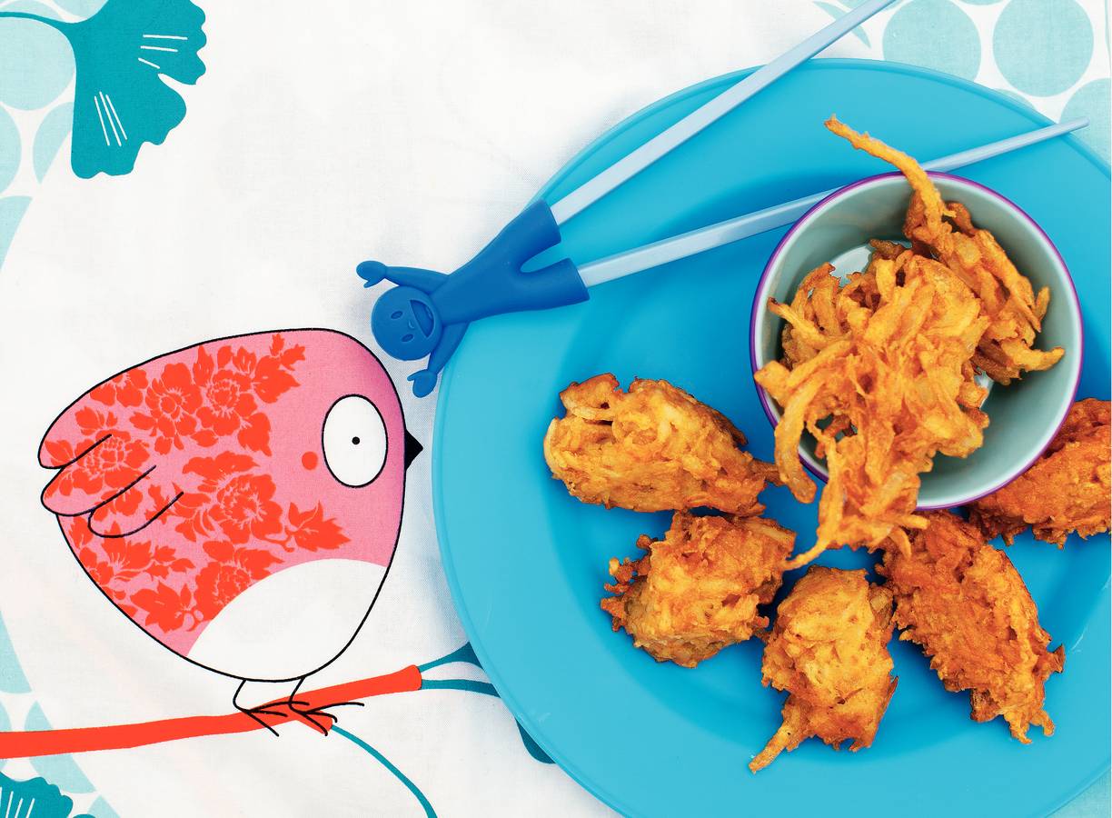 Verhit ondertussen de olie in een ruime wok. Controleer met een stukje brood of de olie heet genoeg is. Is dat het geval, dan begint het brood meteen te bruisen. Schep met 2 lepels telkens 7 hoopjes beslag in de hete olie en frituur 4 min. Herhaal met het aardappel- en peenbeslag. Laat uitlekken op keukenpapier. Lekker met gegrilde kipfilet.