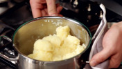 - Giet de aardappelen af, maar vang het kookvocht op. Stamp de aardappelen met de rest van de boter en wat kookvocht met de pureestamper tot puree. Meng de groenten erdoor en breng op smaak met peper en zout.