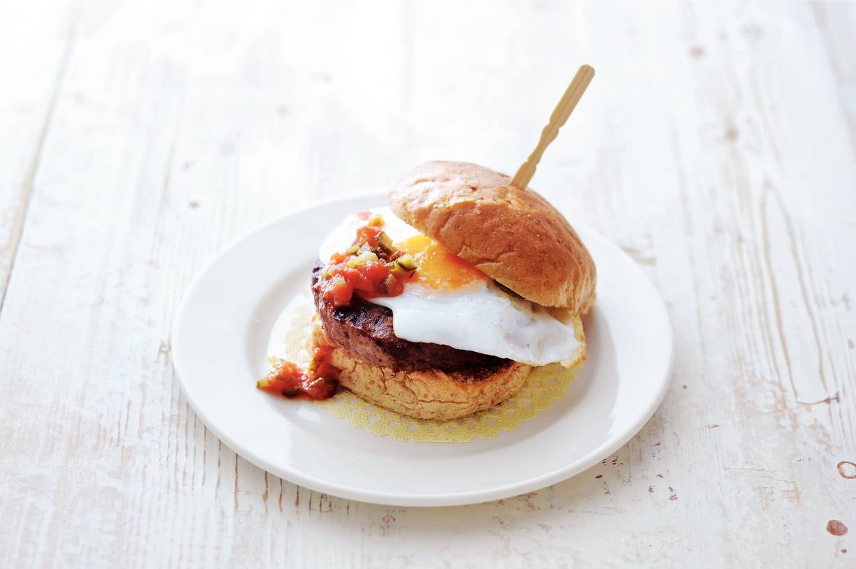 Meng de tomatenblokjes met 4 fijngesneden augurken. Verhit een grillpan en gril 4 hamburgers in 8 min. gaar. Verhit ondertussen de boter in een koekenpan en bak 4 spiegeleieren. Leg de hamburgers ertussen en op elke hamburger een spiegelei en schep er tomatenrelish naar smaak op. Dek af met de bovenste helften van de broodjes.