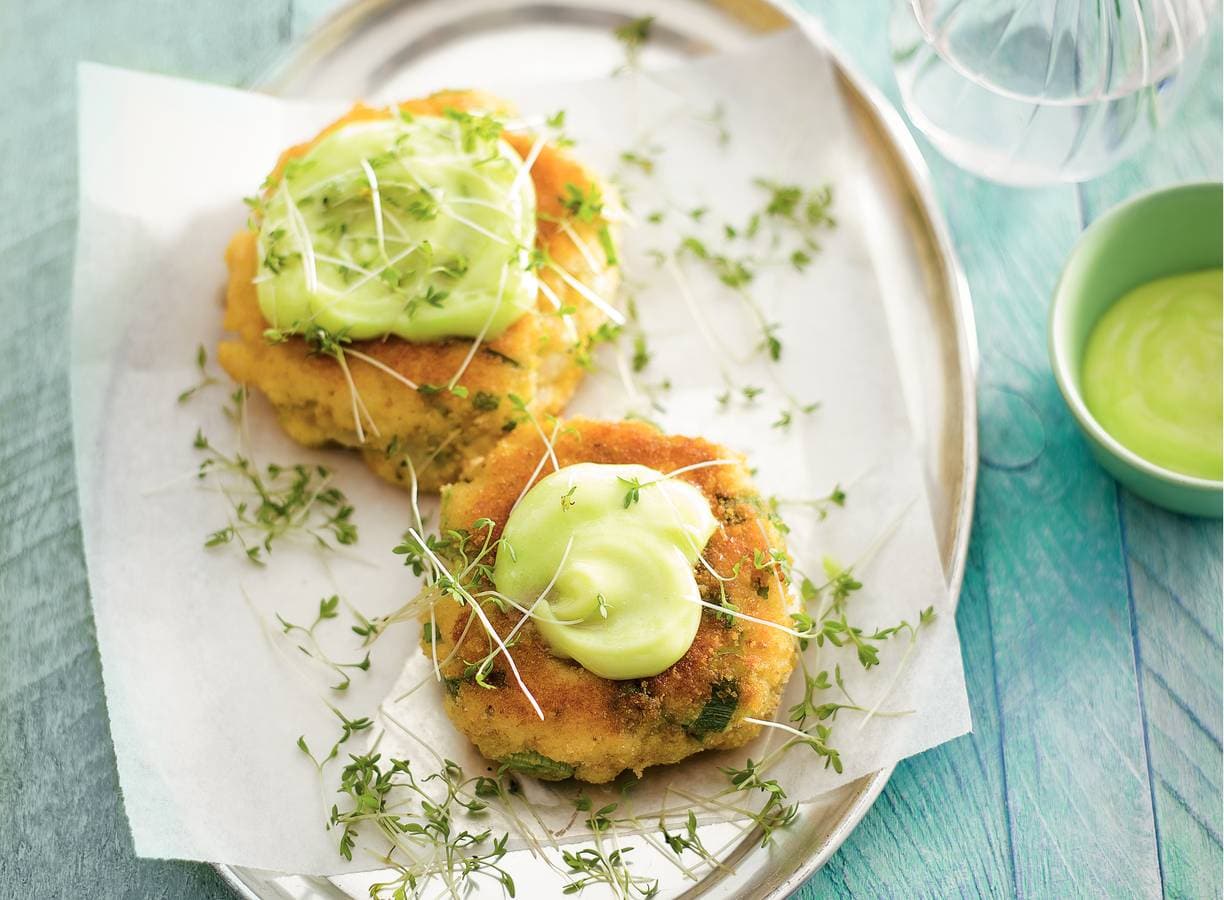 Maal de pangasiusfilet fijn in de keukenmachine. Voeg de bosuitjes en peper en zout naar smaak toe en schep om. Vorm met natte handen 4 burgers van 1.5 cm dik en wentel ze door het ei en de paneermeel. Verhit de olijfolie in een koekenpan en bak in 12 min. gaar. Keer halverwege. Meng de mayonaise met de wasabi. Bestrijk de burgers met de wasabimayo en bestrooi met tuinkers (biologisch).