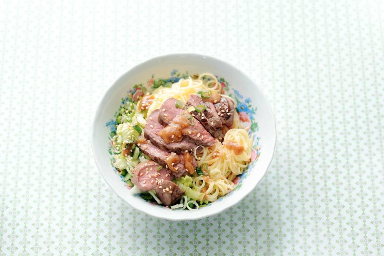 Bak het vlees 5 min. Keer halverwege. Laat 5 min. rusten en snijd in plakjes. Bereid de mie volgens de aanwijzingen op de verpakking. Verdeel de mie, biefstuk, saus en salade over 4 kommen.