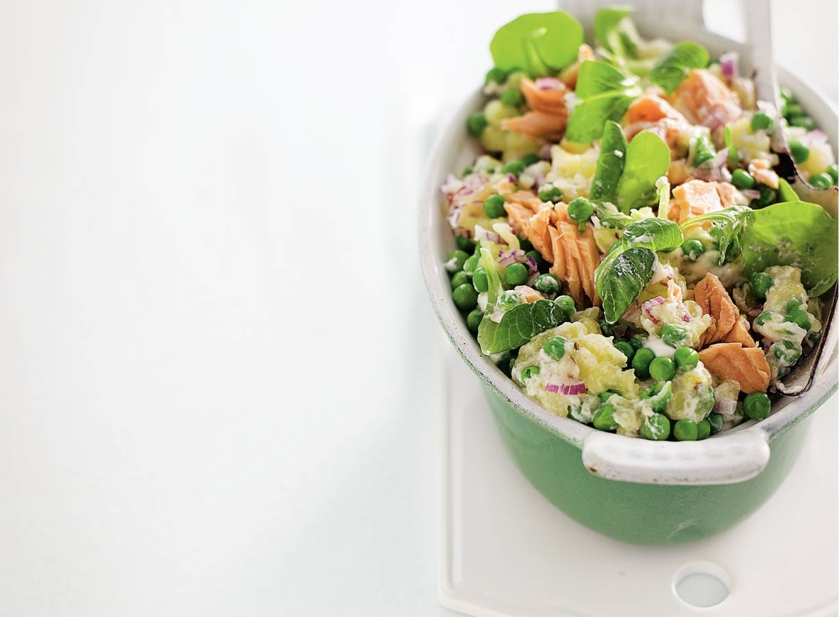 Sla-erwtenstamppot met zalm