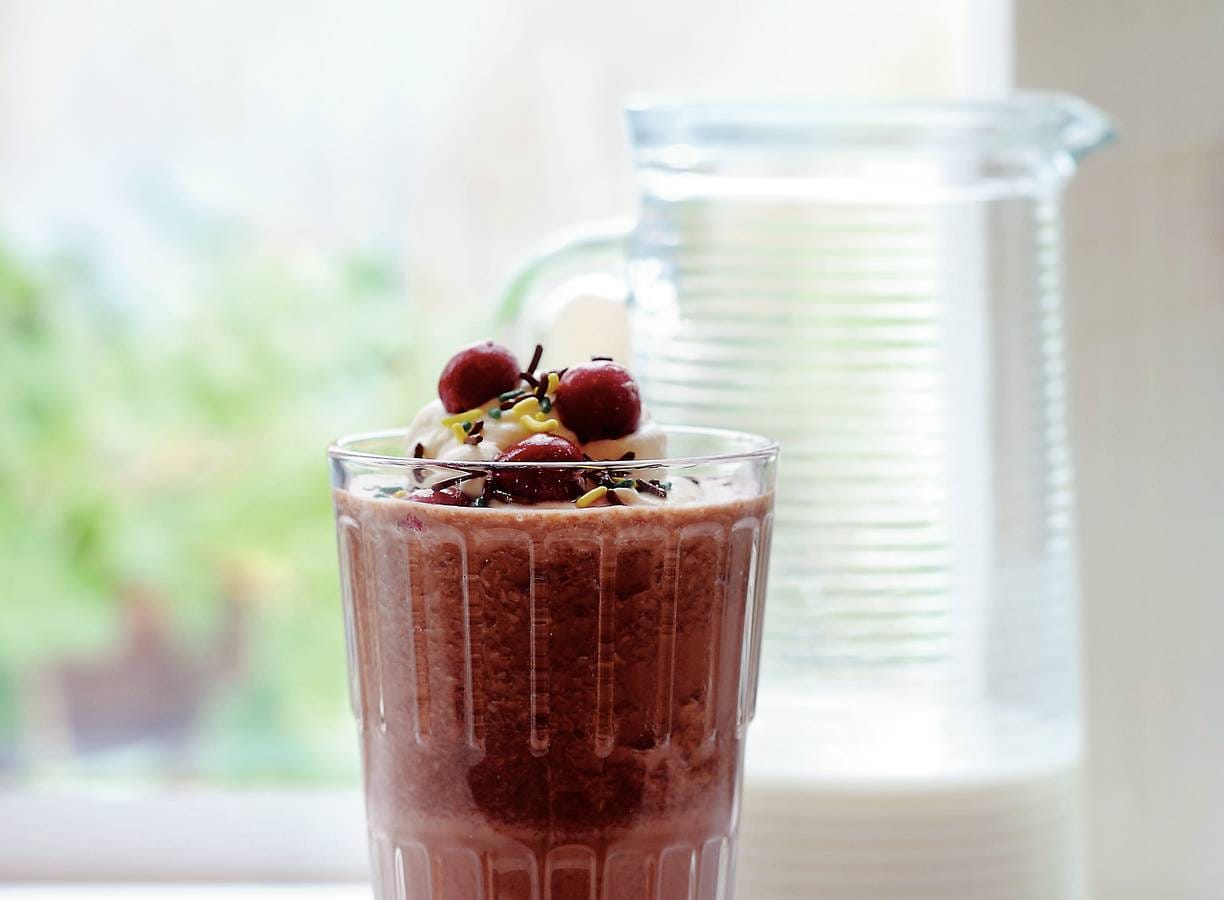 Laat de kokos wellen in 5 el heet kraanwater. Klop ondertussen de slagroom met 1 el suiker stijf. Los de rest van de suiker en de cacao op in 3 el heet water. Houd 4 kersen achter voor garnering. Doe de rest van de kersen met het sap in de blender of keukenmachine. Voeg de kokos, het cacaomengsel en de melk toe. Mix in 30 sec. tot een smoothie.