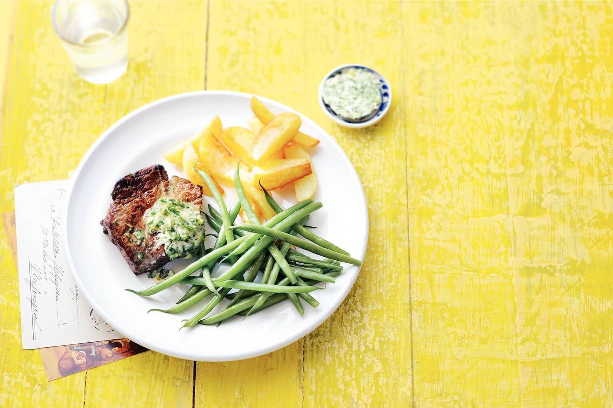 Bestrijk de biefstukken met de olie en bestrooi met peper en zout. Verhit een koekenpan en bak de biefstukken op hoog vuur 4 min. Keer halverwege. Neem uit de pan en laat 5 min. rusten onder aluminiumfolie. Snijd de kruidenboter in plakjes. Verdeel de aardappelen over 4 borden. Leg de biefstukken erbij en verdeel de plakjes kruidenboter over de biefstukken. Lekker met haricots verts.