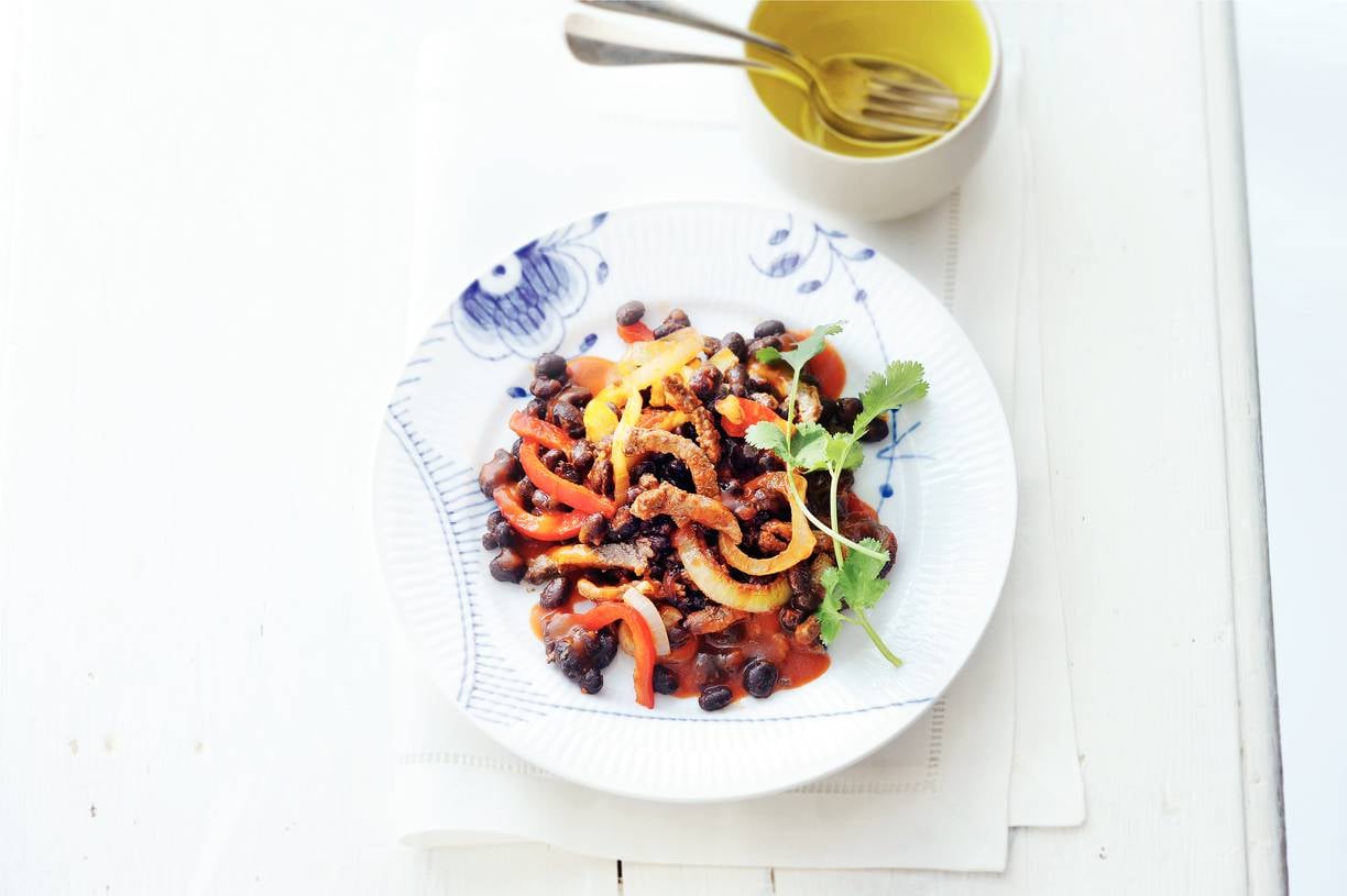 Bestrooi de runderreepjes met peper en zout. Verhit 2 el olie in een koekenpan en bak de reepjes op hoog vuur 2 min. Schep door de chili en serveer direct. Lekker met verse koriander.