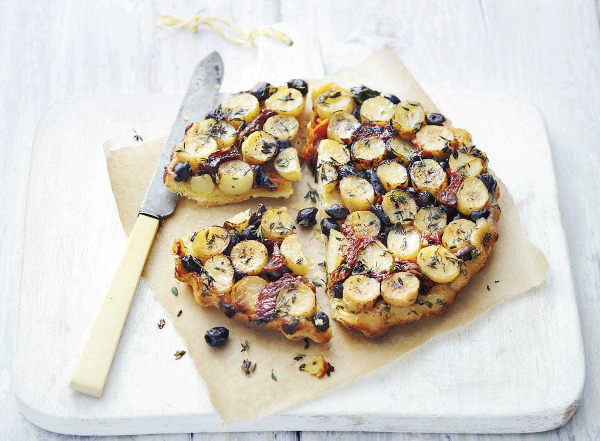 Knapperig bladerdeeg, tijmaardappeltjes en zongerijpte olijven. En dat allemaal in één heerlijk bijgerecht.